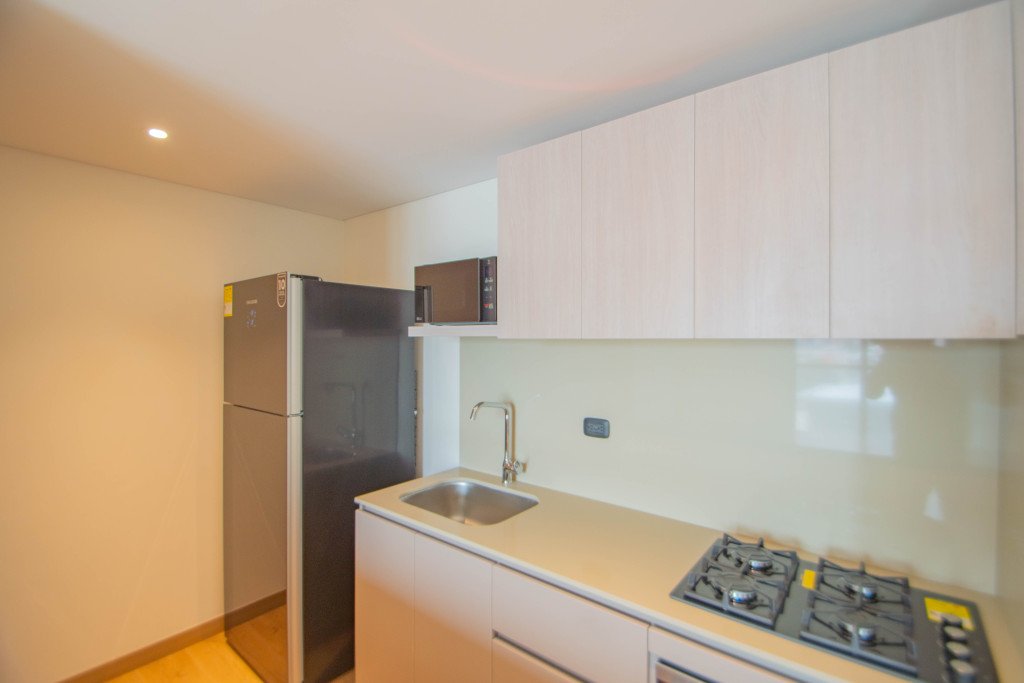 Su distribución integra dos alcobas amplias, clósets de gran capacidad, zona de lavandería privada con lavadora y secadora, cocina integral completamente equipada, microondas, nevera y acabados de alto estándar, creando un entorno funcional, elegante y adaptable a múltiples estilos de vida.