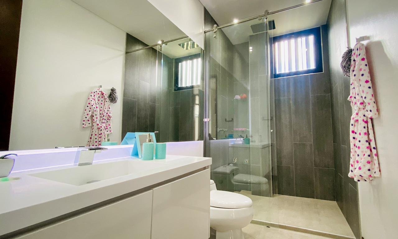 La casa cuenta con 4 habitaciones y 5 baños, lo que la hace ideal para una familia. Además, tiene 2 estudios, un gimnasio, cuarto y baño de servicio, y un depósito para todas sus necesidades de almacenamiento. Con 5 parqueaderos disponibles, no tendrá que preocuparse por el espacio para sus visitantes.
